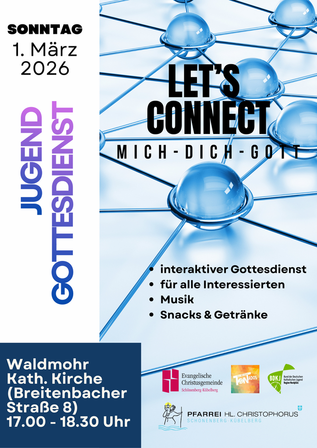 Lasst euch ein auf eine spannende und interaktive Wortgottesfeier zum Thema „LET`S CONNECT MICH-DICH-GOTT“, veranstaltet von Jugendlichen aus der Pfarrei Hl. Christophorus, dem BDKJ Nordpfalz und der Evangelischen Christusgemeinde Schönenberg-Kübelberg.